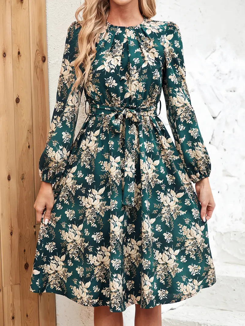 Zielona sukienka midi w beżowe kwiaty z paskiem w talii