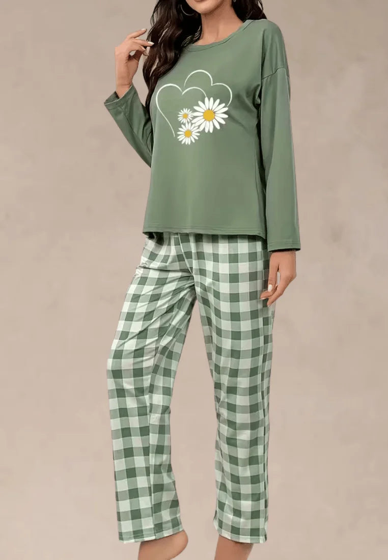 Świeży i niezwykle komfortowy komplet piżamowy w naturalnym, zielonym odcieniu, który idealnie wpisuje się w wiosenno-letni klimat. Gładka koszulka z długim rękawem została ozdobiona uroczym nadrukiem kwiatów w kształcie serca, dodając całości lekkości i dziewczęcego uroku.