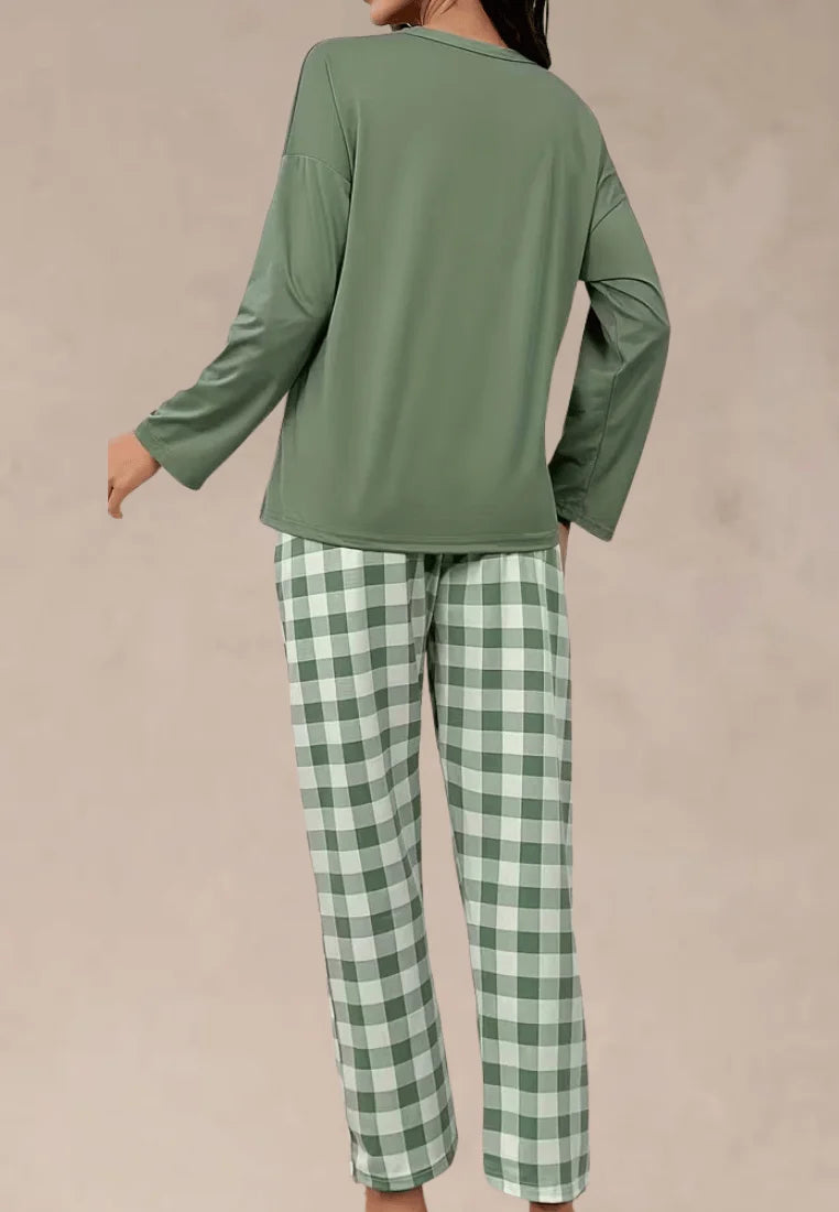 Zielony komplet piżamowy damski z długim rękawem i długimi spodniami w kratę