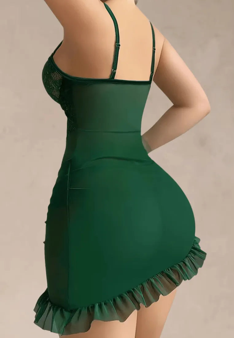 Zmysłowy komplet bielizny koronkowej z tiulem w kolorze zielonym to połączenie elegancji i uwodzicielskiego wdzięku. Gorsetowy krój z usztywnianymi miseczkami podkreśla biust, a delikatna koronka w głębokim odcieniu granatu dodaje klasy i tajemniczości. Przezroczysty tiul subtelnie otula ciało, tworząc efekt lekkiej mgiełki, a falbanka u dołu nadaje całości romantycznego charakteru.